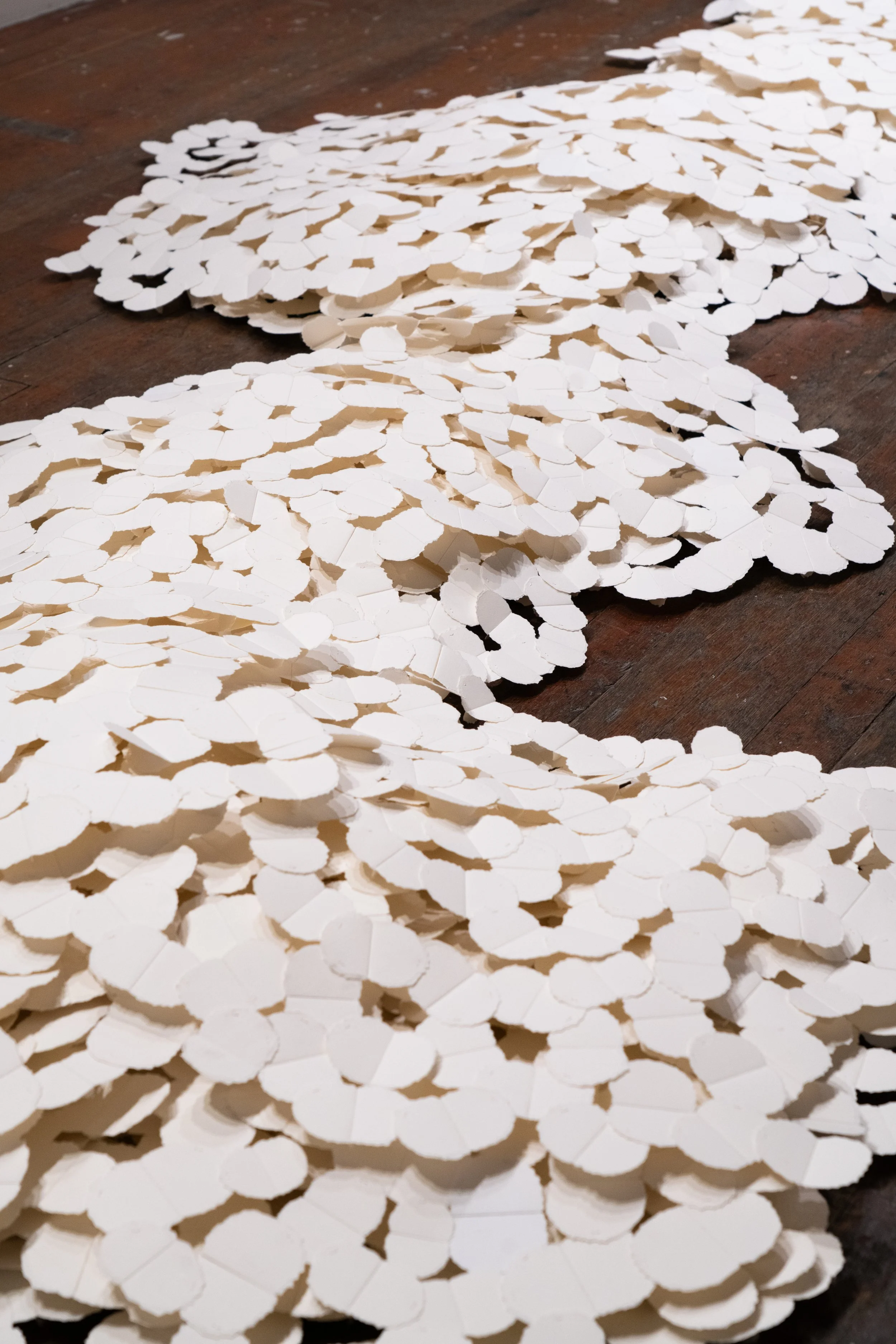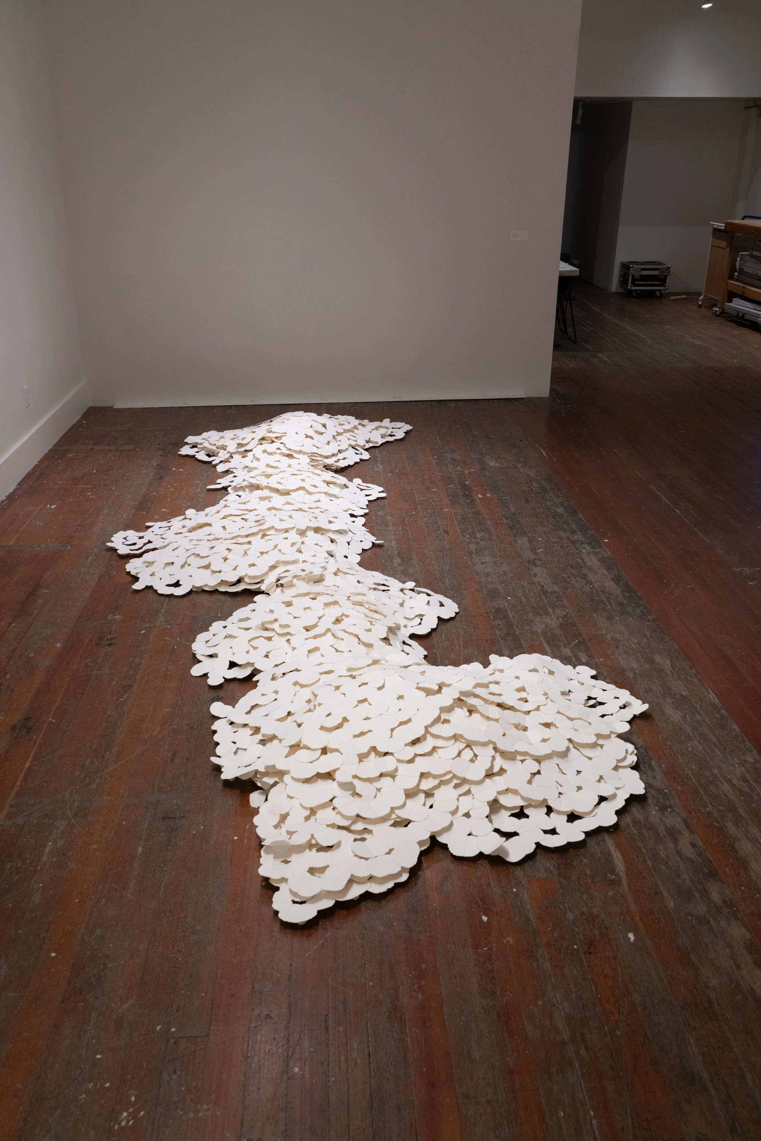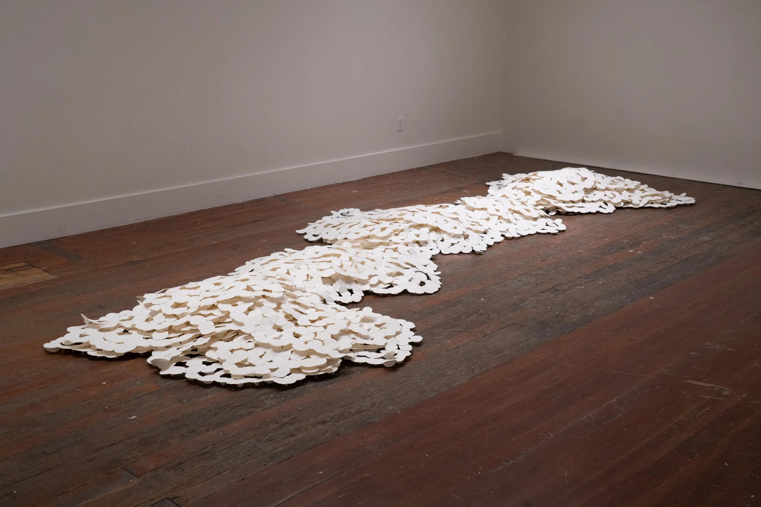 Hundreds of Thousands, Version 2, 2025, Paper, silk thread, 15 x 5 x 1 1/2 ft.